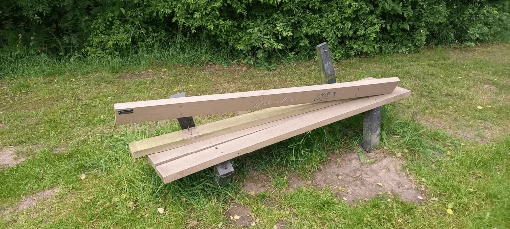 Drie jongens van ongeveer 10 / 14 jaar oud die kennelijk niet zijn opgevoed om van andermans spullen af te blijven hebben opzettelijk de bank gesloopt. Een van de kinderen was opvallend gekleed met een opvallende regenbooggekleurde zwembroek aan. Hij had geen t-shirt aan. De drie kids zijn doorgefietst naar Elim en zullen nu grote verhalen hebben in hun vriendengroep.