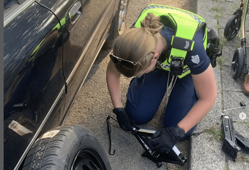 Samen met een groepje jeugd wat ons toevallig passeerde, hebben wij de auto naar een veilige plek in de schaduw kunnen duwen. Eenmaal daar heeft een van de collega’s de band verwisseld. En enkele minuten later kwam de wegenwacht aan, deze heeft de band nog even gecontroleerd en kon weer door naar de volgende melding.