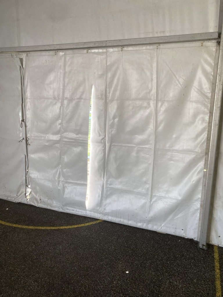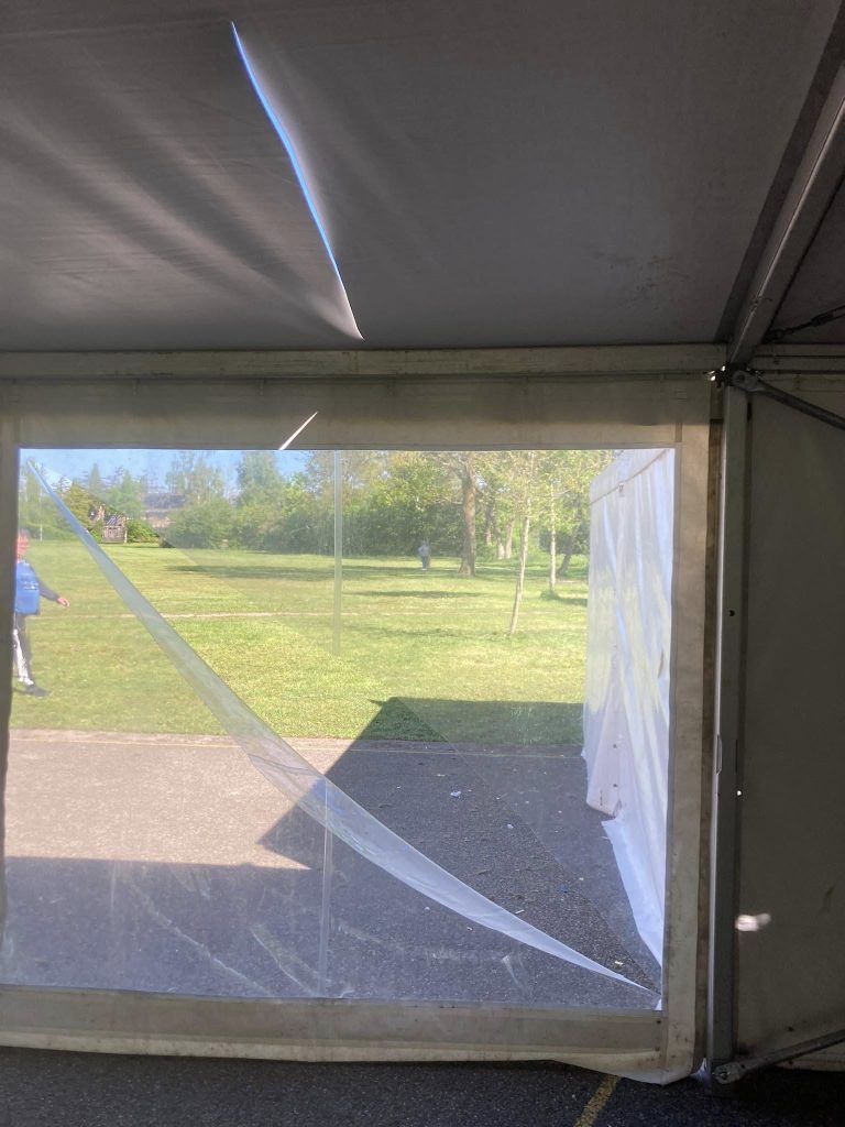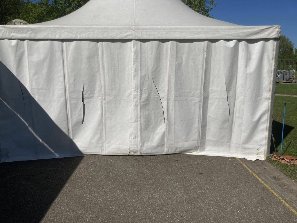 Vandalen, die waarschijnlijk niet al te snugger zijn, hebben de tenten met een scherp voorwerp bewerkt. Grote gaten zijn er nu te zien in de wanden en ook in de daken. Dit is echt een dikke domper voor de organisatie en voor hun direct de vraag of ze volgend jaar nog wel een Koningsdag willen of kunnen organiseren, de schade loopt namelijk in de tienduizenden euro’s en dat is een gigantisch bedrag.