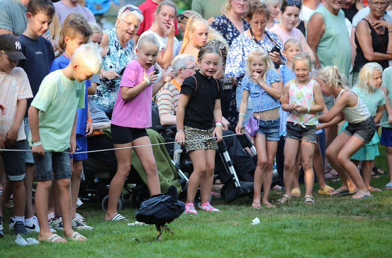 Er waren veel mensen afgekomen op de roofvogelshow, met prachtige vogels. De kinderen en de volwassenen werden erbij betrokken , om deel te nemen aan de show .