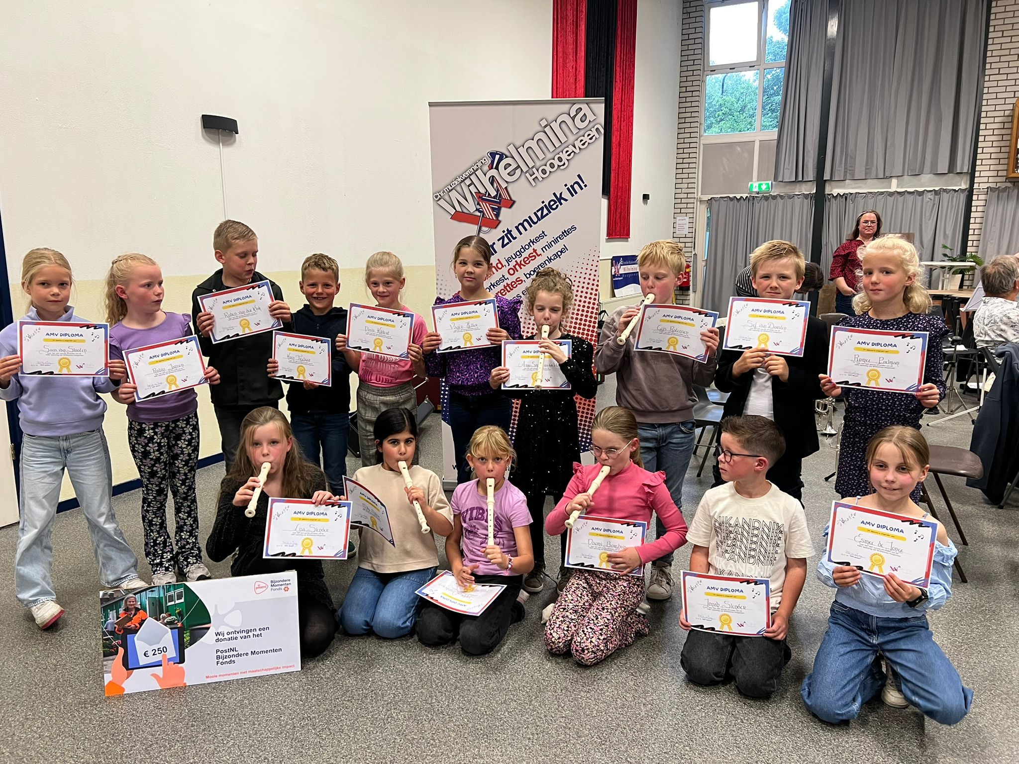 De vereniging heeft in 2025 een tweetal AMV cursussen georganiseerd op de CBS de Regenboog en op de CBS ‘Kofschip. Leerlingen hebben in de AMV lessen met behulp van blokfluiten kennis gemaakt met muziek maken en in het WMC gebouw van Wilhelmina laten zien en horen wat ze geleerd hebben voor heelveel aanwezige ouders, opa’s en oma’s en andere belangstellenden. De trotse kinderen ontvingen allemaal een AMV diploma.