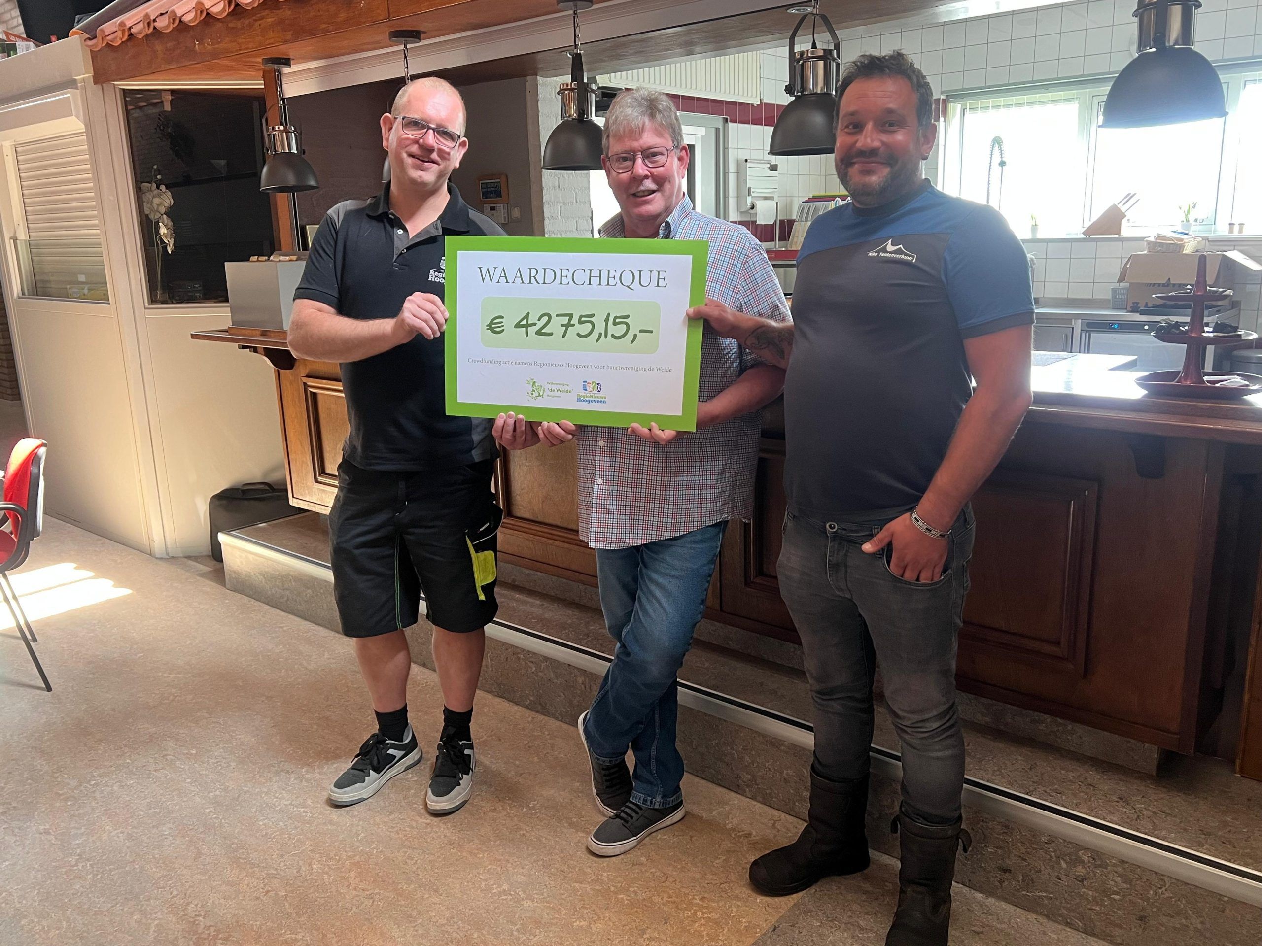 Hoogeveen – De nacht na koningsdag zijn de tenten vernield die Wijkvereniging de Weide huurde van ondernemer Niko Tentverhuur. Beide zaten met de handen in het haar om de schadepost van ruim over de €10.000,-. De reacties op Facebook over het incident waren overweldigend, waarna Regionieuws Hoogeveen in samenspraak met de wijkvereniging een crowdfunding heeft opgestart. En met flink resultaat, want de uiteindelijke cheque heeft een waarde van €4275,15. Gerard Duinkerken, voorzitter van Regionieuws Hoogeveen overhandigde de cheque aan Wijkvereniging de Weide en ondernemer Niko Tentverhuur.
