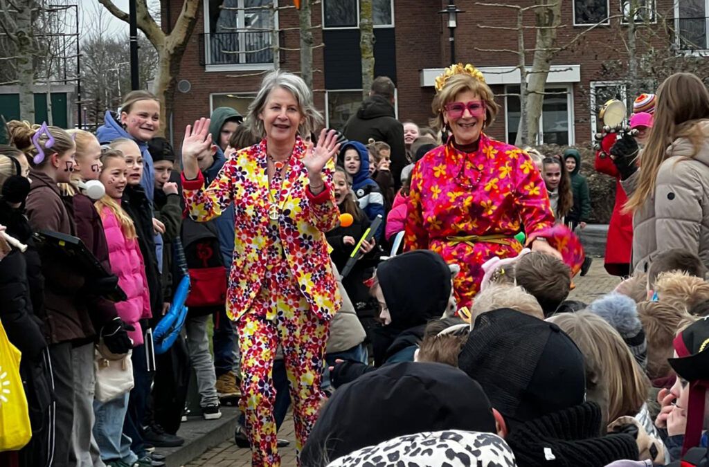 De juffen werden vanmorgen muzikaal onthaald door de kinderen van de school, die allemaal verkleed waren en met muziekinstrumenten hen opstonden te wachten in het dorpscentrum. Zij werden luidruchtig begeleid naar het schoolgebouw aan de Jan Naardingweg 56.