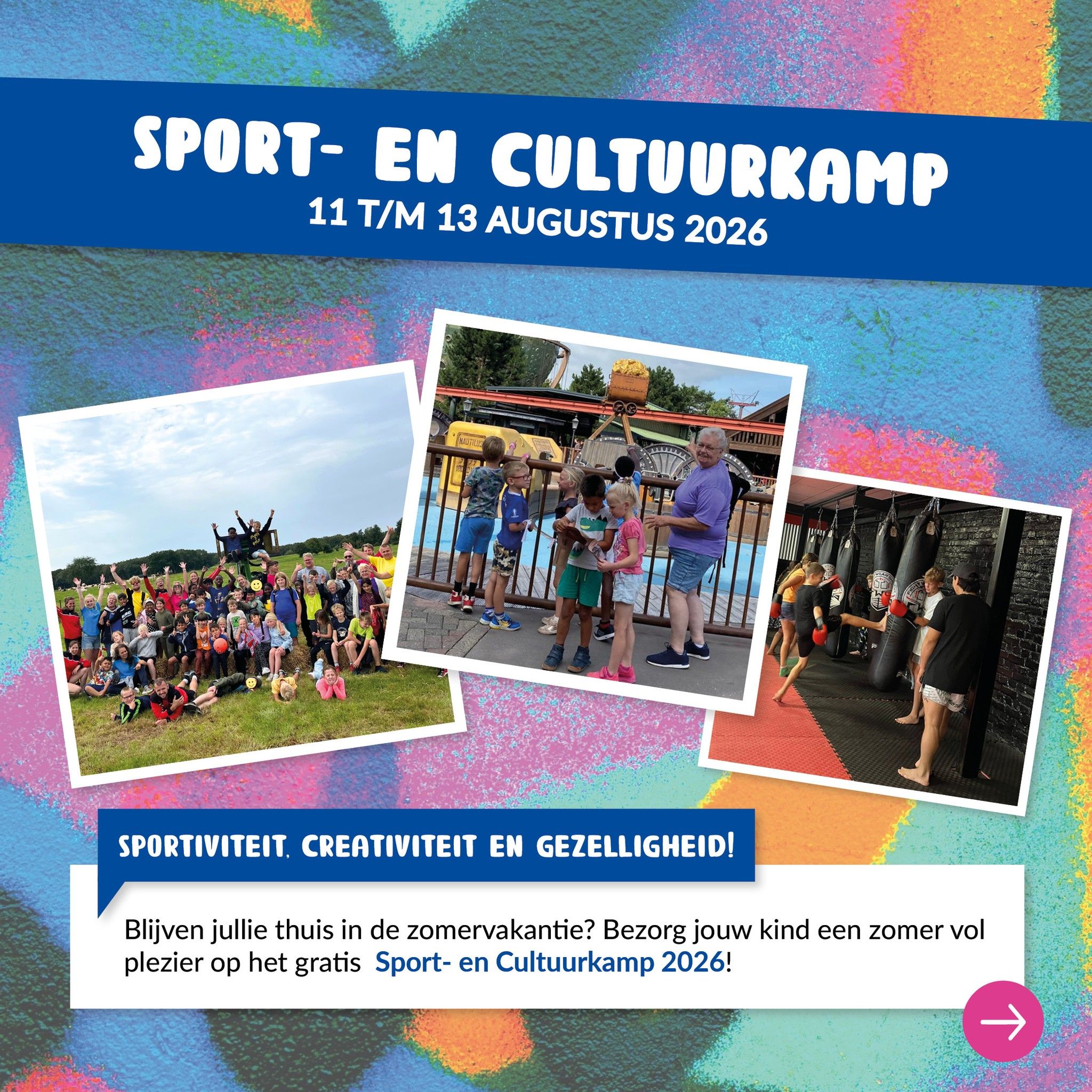 Het Sport- en Cultuurkamp wordt georganiseerd voor kinderen uit groep 3 t/m 8 die om verschillende redenen niet op vakantie gaan. Denk aan financiële zorgen, jonge mantelzorgers, bijzondere gezinssituaties etc. De organisatie is in handen van de jongerenwerkers en de sportfunctionarissen van Hoogeveen en De Wolden.