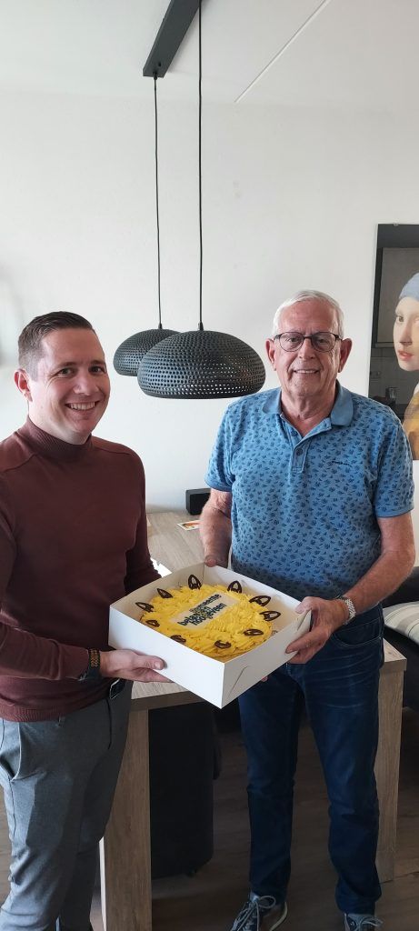 Gemeentebelangen heeft afgelopen week taarten uitgedeeld uit het hart. Tijdens de jaarmarkten in Nieuwlande en Noordscheschut konden bezoekers raden hoeveel harten in de bol zaten. Fractielid Aron Sieders bezocht de winnaar Klaas Ballast in Hoogeveen. Klaas vertelde fractielid Hilma Hooijer te kennen vanuit de krant. “Ik spel het nieuws en lees dus ook wat Gemeentebelangen zoal doet voor onze gemeente. Hilma staat dan ook wel vaak op de foto bij het artikel. Dit voorjaar zaten we tegelijk op een terrasje aan de Costa Blanca. Het was leuk om haar nu te treffen op de jaarmarkt en even bij te praten en tja, dan ook even raden hoeveel hartjes in de glazen bol liggen. Ik ben blij verrast dat ik ‘m gewonnen heb en we zullen de taart met smaak opeten”.