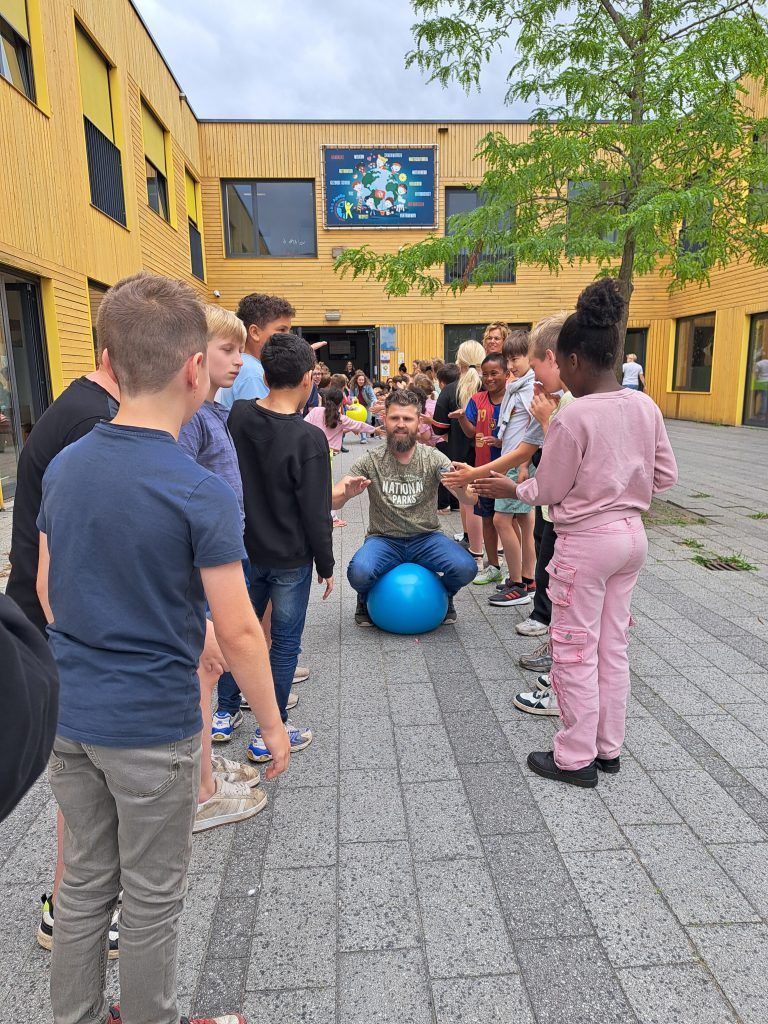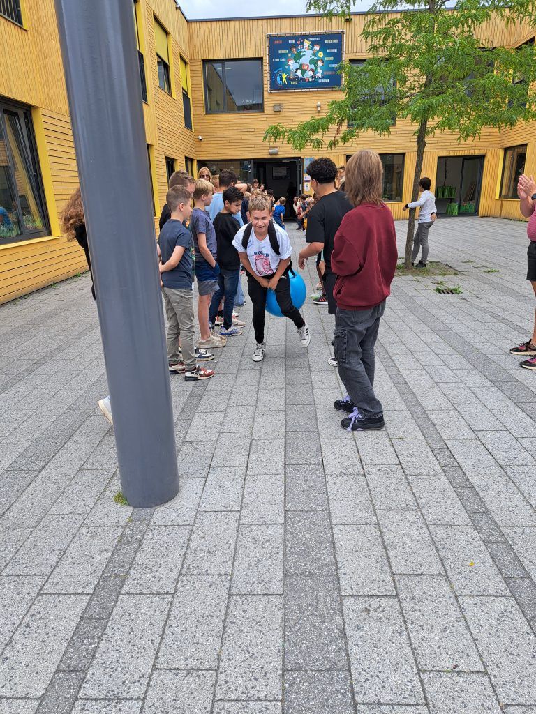 Vandaag stuiterde groep 8 samen met meester Thomas van Obs Apollo door een erehaag op een skippybal de school uit.