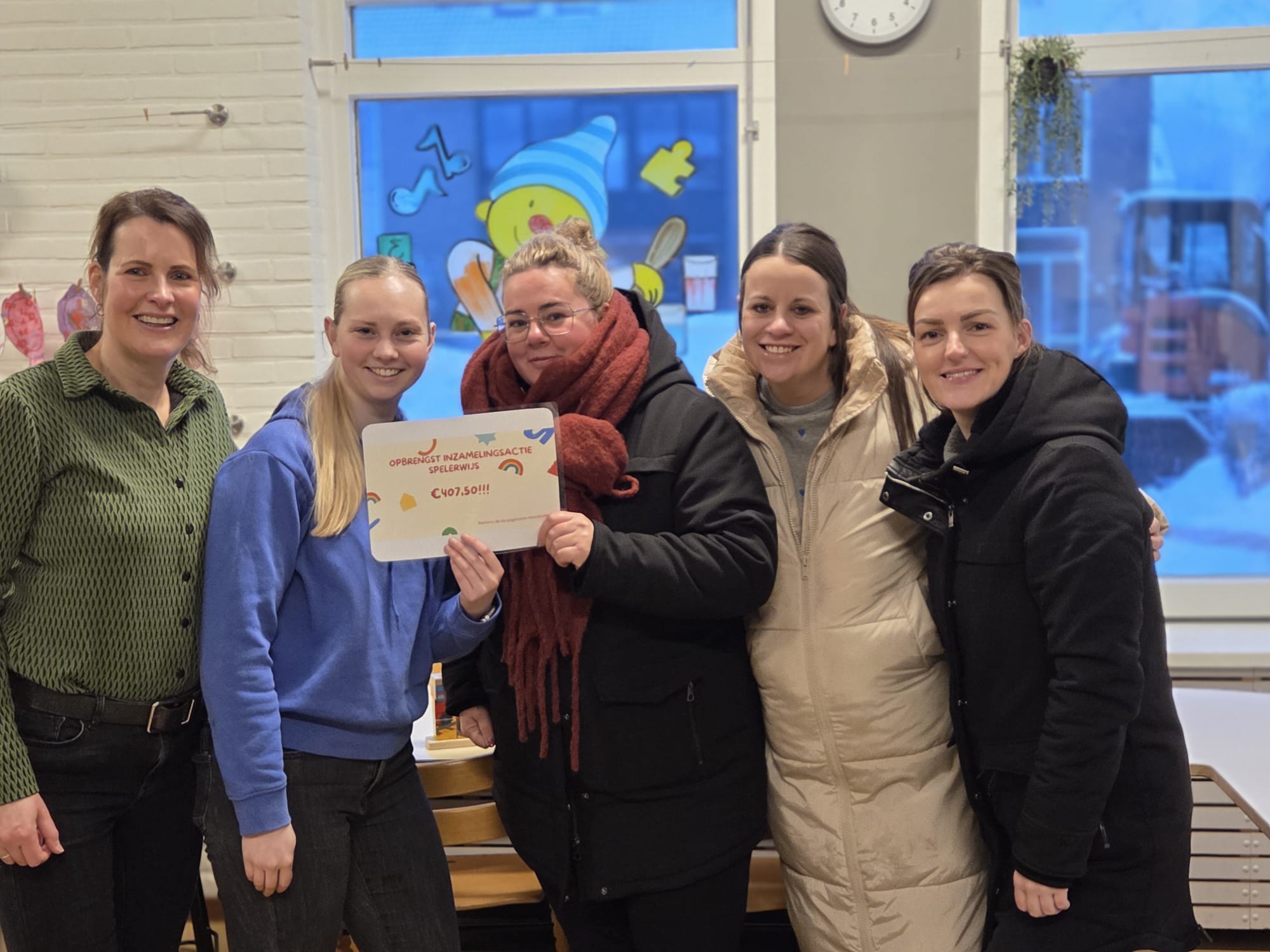 Dinsdagmorgen werden de juffen verrast door de ouders met een mooi bedrag  van ruim 407 euro dat opgehaald was voor deze speelattributen.