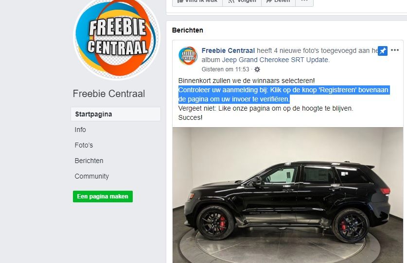 Regio- Er gaan waarschuwingen uit voor een frauduleuze actie op Facebook. De mensen achter Freebie Centraal beweren dat je een Jeep Grand Cherokee SRT kan winnen, maar eigenlijk proberen ze zo aan je persoonsgegevens te komen. De Nepwinactie verzamelde in Nederland al 300.000 reacties volgens Topgear