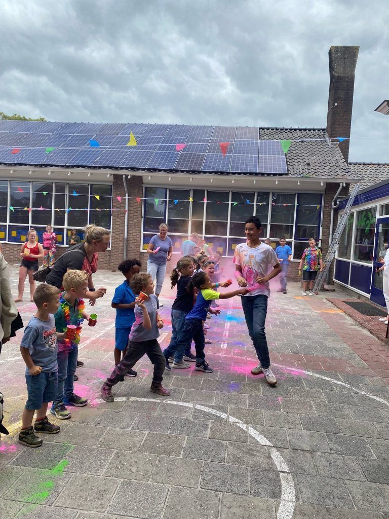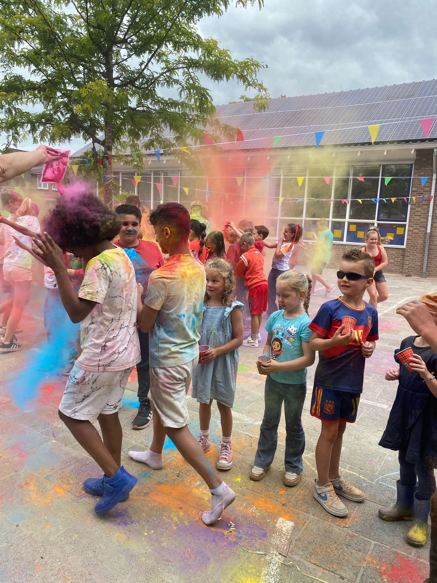 Eerst werd er in alle kleuren van de regenboog genoten van hapjes gemaakt door de ouders en aansluitend werd groep 8 de school uitgegooid met poeder in allerlei kleuren!