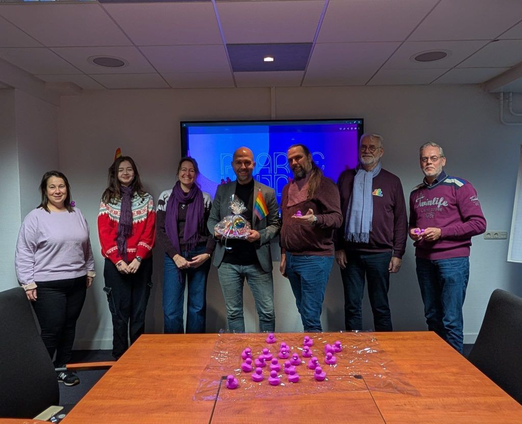 Wethouder Mark Tuit ontving een speciaal regenboog-eendje als symbool van inclusie en diversiteit. De actie benadrukte dat niemand zich alleen hoeft te voelen, ongeacht geaardheid, gender of identiteit.