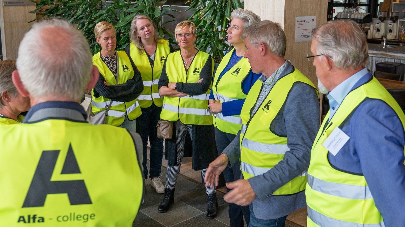 Jan Berend van Wijk, regiodirecteur Alfa-college, ontving het gezelschap in het duuurzaamheidscentrum dat in de school ontwikkeld wordt. Hij vertelde dat de visie van het Alfa-college is gestoeld op drie pijlers. ‘We bereiden studenten voor op een toekomst waarin ze iets voor een ander kunnen betekenen, leveren een bijdrage aan een sterke regio en een betere wereld. Dat doen we onder meer door ons in te zetten voor een inclusieve samenleving, te investeren in mensen, gezondheid en vitaliteit te stimuleren, duurzaam samen te werken en studenten te stimuleren in duurzaam ondernemerschap.’ De school is aan revitalisatie toe omdat er vanwege een voorspelde afname van het aantal studenten in de toekomst minder ruimte nodig is en omdat het voormalige gebouw van de MTS niet meer voldoet aan de eisen van de huidige tijd. Het werd gebouwd in de jaren ’60 van de vorige eeuw en hoewel het een iconisch gebouw is voor veel Hoogeveners en het bouwkundig interessante details heeft, wordt dit deel van de school grotendeels gesloopt. Een deel blijft staan, maar krijgt een nieuwe schil, die de school energiezuiniger maakt en een langere levensduur oplevert. Het Alfa-college wordt dankzij de circulaire revitalisatie zelfs nagenoeg aardgasloos. De revitalisatie wordt uitgevoerd door aannemer HuneBouw uit Hoogeveen, die de uitdaging met beide handen aangreep. Directeur Klaas Graveland: ‘Toen ik ondernemer werd, had ik al voor ogen dat bouwprojecten iets kunnen bijdragen aan de omgeving. De revitalisatie van Alfa-college past daarom bij ons. Het traject beslaat twee jaar en bestaat uit tien bouwfases. In elke fase wordt opnieuw nagedacht over circulariteit en duurzaamheid. De uitgangspunten daarvoor zijn de toename van de CO2-productie en het toekomstige tekort aan grondstoffen. Daarom geven we materialen een tweede leven, verbouwen wezoveel mogelijk remontabel, beperken we de CO2-productie, kiezen we voor economische levensduur en Total Cost of Ownership, oftewel de totale kosten gedurende de hele levenscyclus.’