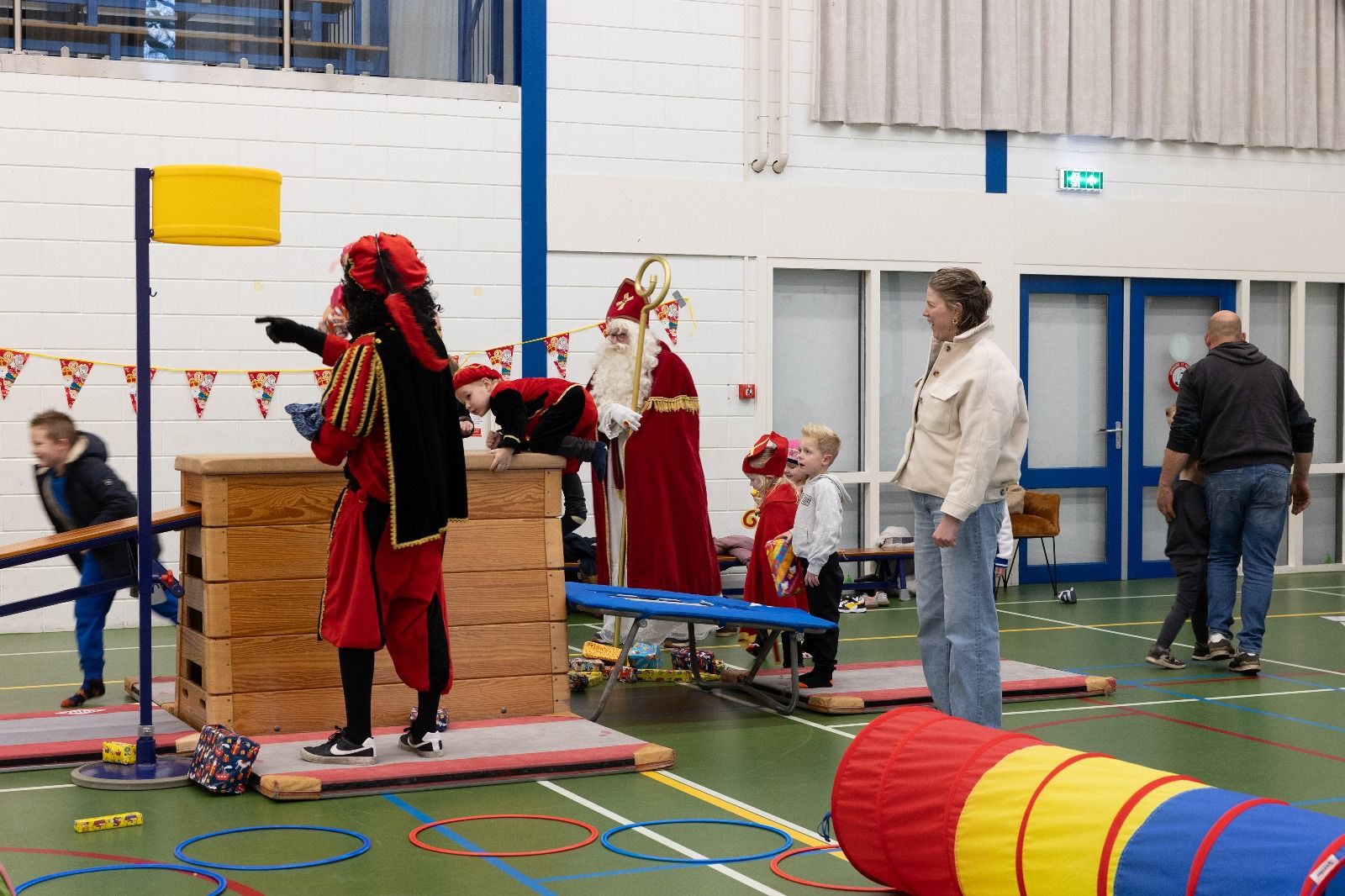 Bij het dorpshuis wachten de kinderen hem op waarna de stoet naar binnen ging. Hier was een mooie pietencircuit uitgezet, waar Sinterklaas keek of dit allemaal wel goed ging. Ook konden de kindertjes samen op de foto met Sinterklaas. Foto: Johan Lunenborg