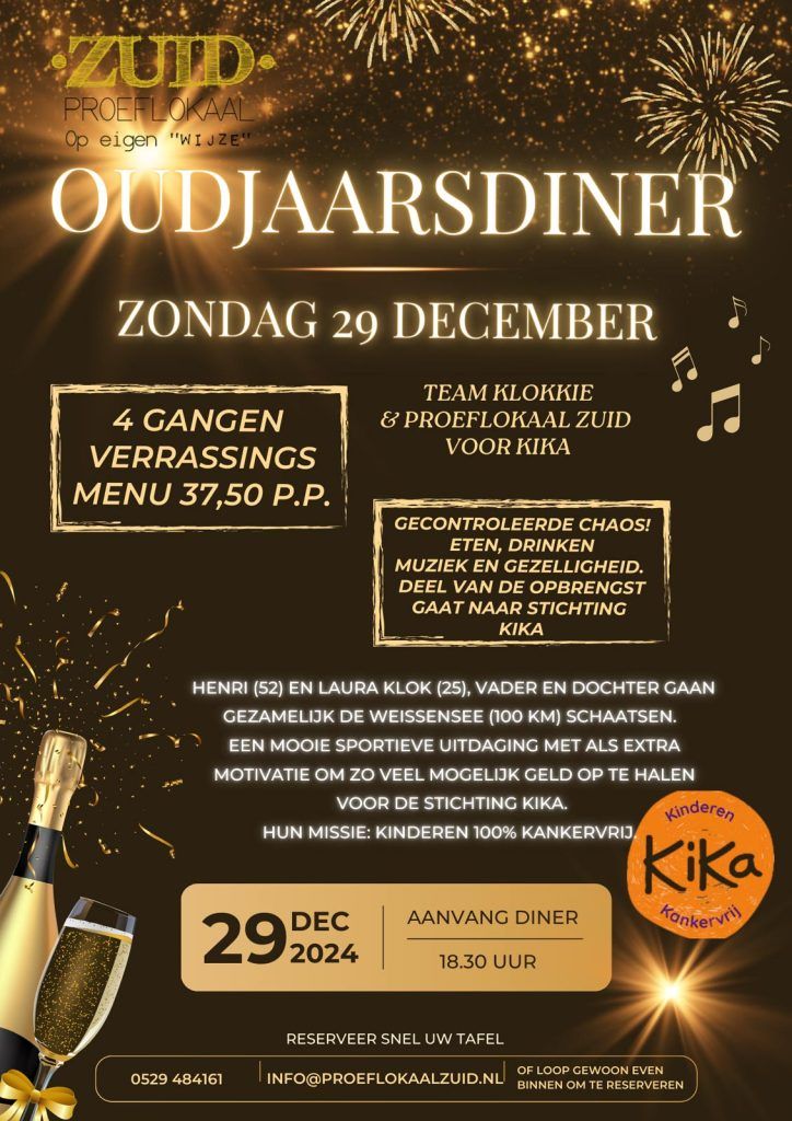 Laura Klok en haar vader Henri Klok gaan op 24 januari de uitdaging aan om de alternatieve Elfstedentocht te schaatsen op de Weissensee. Dit gaan ze doen ik het kader van Schaatsen voor KiKa en hopen met hun actie zoveel mogelijk geld op te halen voor onderzoek naar kinderkanker. Inmiddels staat de teller al op een mooi bedrag maar daar kan uiteraard nog meer bij. Één van de acties die nog gepland staat is een oudjaarsdiner bij Proeflokaal Zuid in Nieuwleusen. Tijdens deze avond wordt een 4 gangen verassingsdiner geserveerd en zullen Laura en Henri voor het entertainment verzorgen waarbij mooie prijzen te verdienen vallen. Opgeven kan nog bij Proeflokaal Zuid in Nieuwleusen, wees er snel bij want ze zitten bijna vol!
