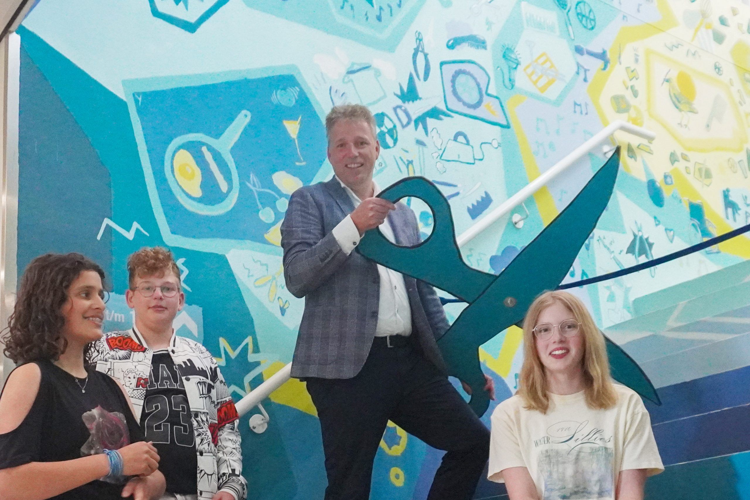 Foto: Bestuurder Kristiaan Strijker en leerlingen Pepijn, Mette en Thalia openen de kleurrijke trap.
