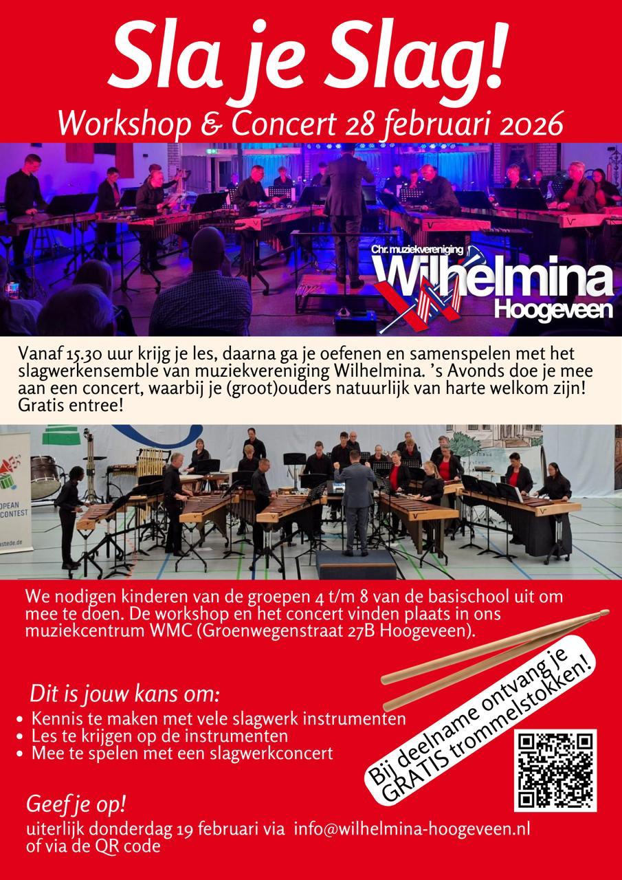 Ben jij klaar om je helemaal uit te leven op slagwerkinstrumenten? Op zaterdag 28 februari 2026 organiseert muziekvereniging Wilhelmina Hoogeveen een superleuke slagwerkworkshop mét avondconcert voor kinderen uit groep 4 t/m 8.