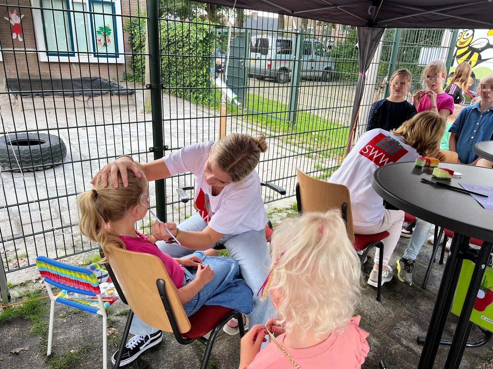 De kinderen vermaakten zich geweldig met de speelmaterialen uit de Zoembus, voetballen in de pannakooi en springen op de springkussens. Schminken was een hit, met creaties van Spiderman tot unicorns. En wat is een zonnige middag zonder een hoorntje schepijs? Voor de kleintjes was er een speurtocht rondom het boek ‘Rupsje Nooitgenoeg’.
