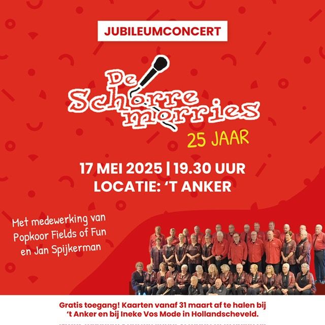Op zaterdag 17 mei aanstaande houdt Gezelligheidskoor De Schorre Morries uit Hollandscheveld haar jubileumconcert ter ere van hun 25-jarige bestaan. Dit feestelijke concert is gratis toegankelijk en naast het koor zal ook medewerking worden verleend door Popkoor Fields of Fun en door zanger Jan Spijkerman. De repetitieruimte (grote zaal van Het Anker) is vanwege de beperking van het maximale aantal bezoekers veel te klein voor dit grootste concert. En daarom wordt speciaal voor deze gelegenheid op de parkeerplaats achter Het Anker een grote feesttent gebouwd die naast alle artiesten plaats biedt aan ruim 200 gasten.
