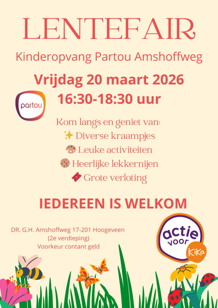 Kinderopvang Partou Amshoffweg opent op 20 maart van 16.30-18.30 uur haar deuren voor iedereen. Er zal een gezellige lentefair gehouden worden met diverse kraampjes met producten, eten en drinken. Ook zijn er activiteiten voor de kinderen zoals een minidisco en schminken. Bovendien is er een mooie verloting met leuke prijzen, gesponsord door diverse ondernemers uit de buurt. De opbrengst willen wij schenken aan KIKA. Let op: wij zelf hebben geen pinapparaat dus graag contant geld meenemen, bij sommige kramen kunt u wel pinnen. Graag tot 20 maart!