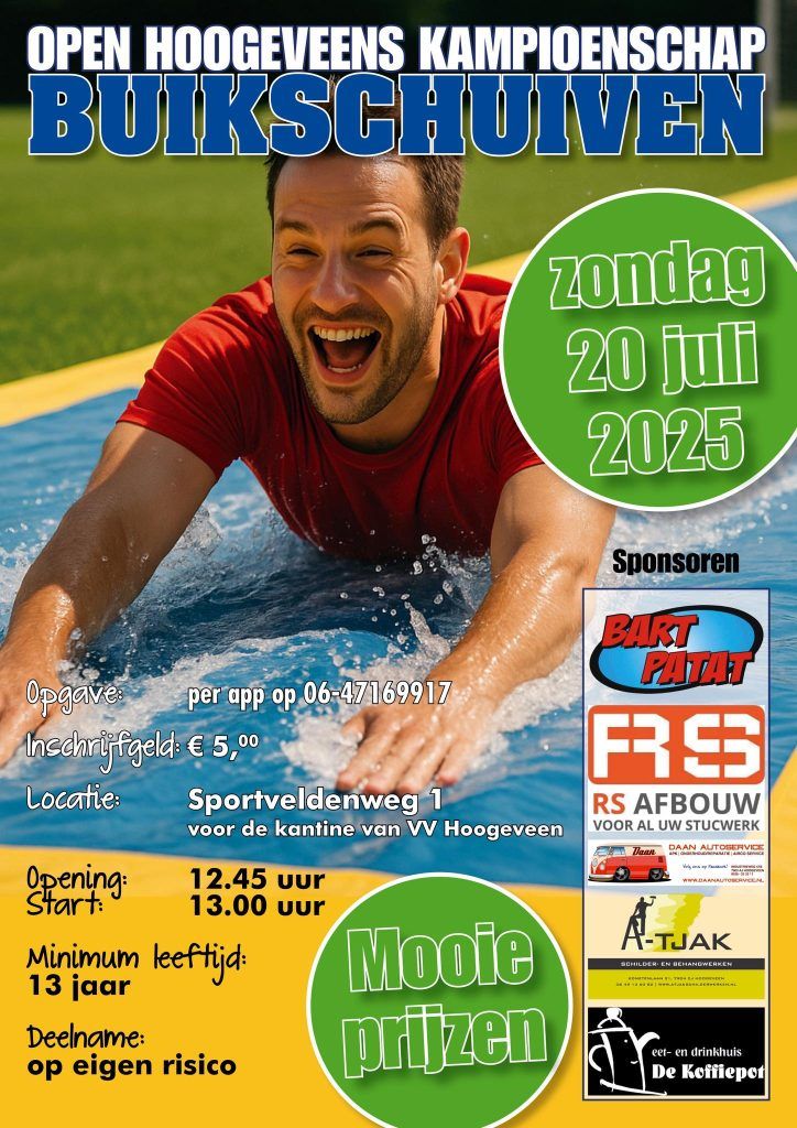 Bij V.V.Hoogeveen gaan ze hem weer doen! Het Open Hoogeveens Kampioenschap buikschuiven. Zondag 20 juli smeren we de baan weer in met zeep!