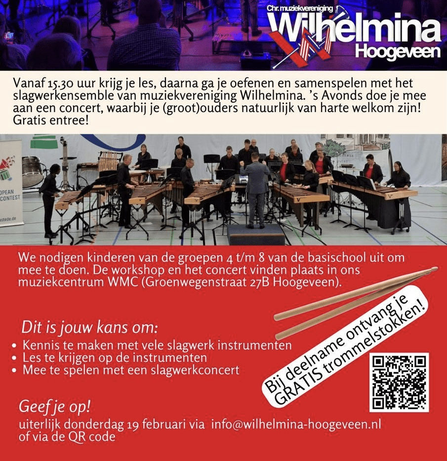 Ben jij klaar om je helemaal uit te leven op slagwerkinstrumenten? Op zaterdag 28 februari 2026 organiseert muziekvereniging Wilhelmina Hoogeveen een superleuke slagwerkworkshop mét avondconcert voor kinderen uit groep 4 t/m 8.