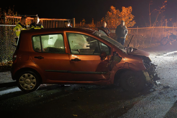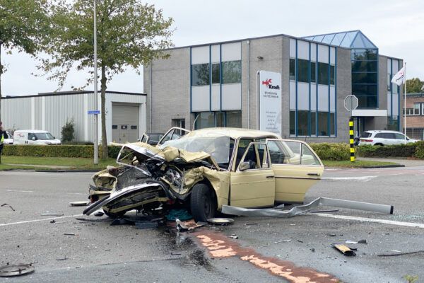 Auto totaal vernield na botsing met afsluitbak van het riool aan Griendtsveenweg