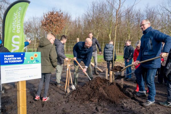 Zestig leerlingen van Het Mozaïek en Het Hoeltien geven het startsein voor een nieuw bos van zestien hectare bij Hollandscheveld….