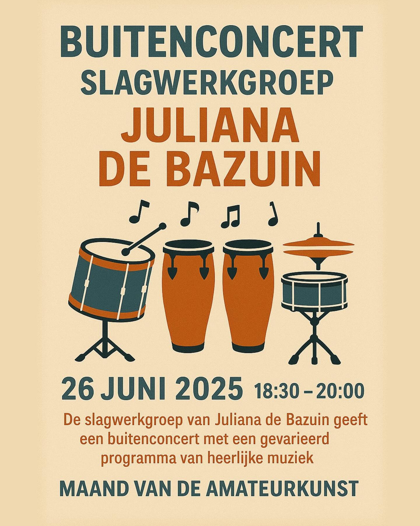 Zin in een muzikale zomeravond? Kom op 26 juni van 18:30 tot 20:00 naar het buitenconcert van de slagwerkgroep van Juliana de Bazuin!