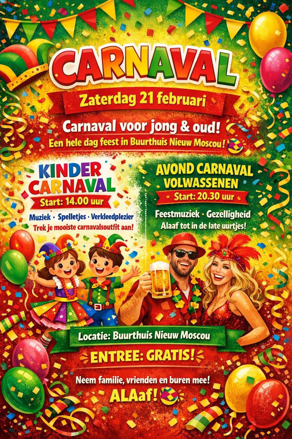 Zaterdag 21 Februari is het weer zo ver Carnaval Nieuw Moscou !! Trek je leukste gekste verkleed kleren aan en kom langs,  S’middags om 14.00 uur voor de kinderen!