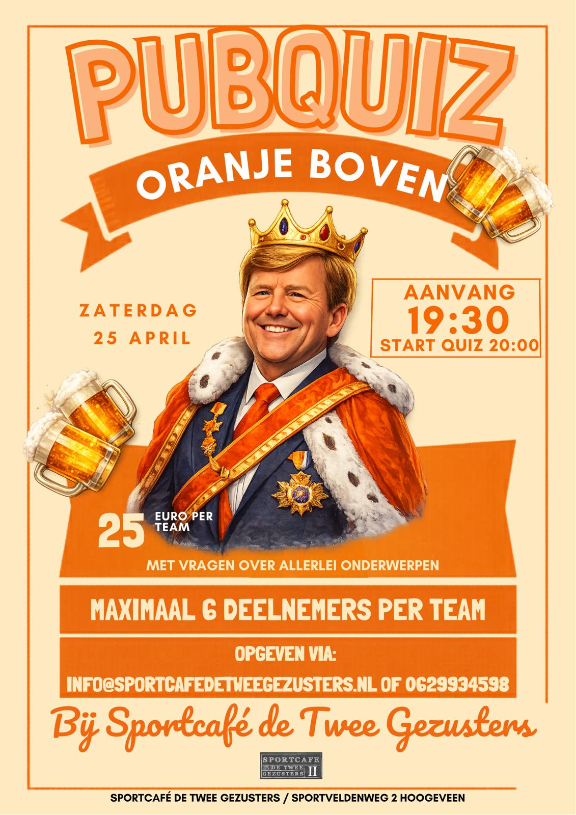 Bij Sportcafé de Twee Gezusters wordt op zaterdagavond 25 april een pubquiz georganiseerd met als thema Oranje boven. Een lekker avondje uit met vrienden of familie. Opgeven kan via de...