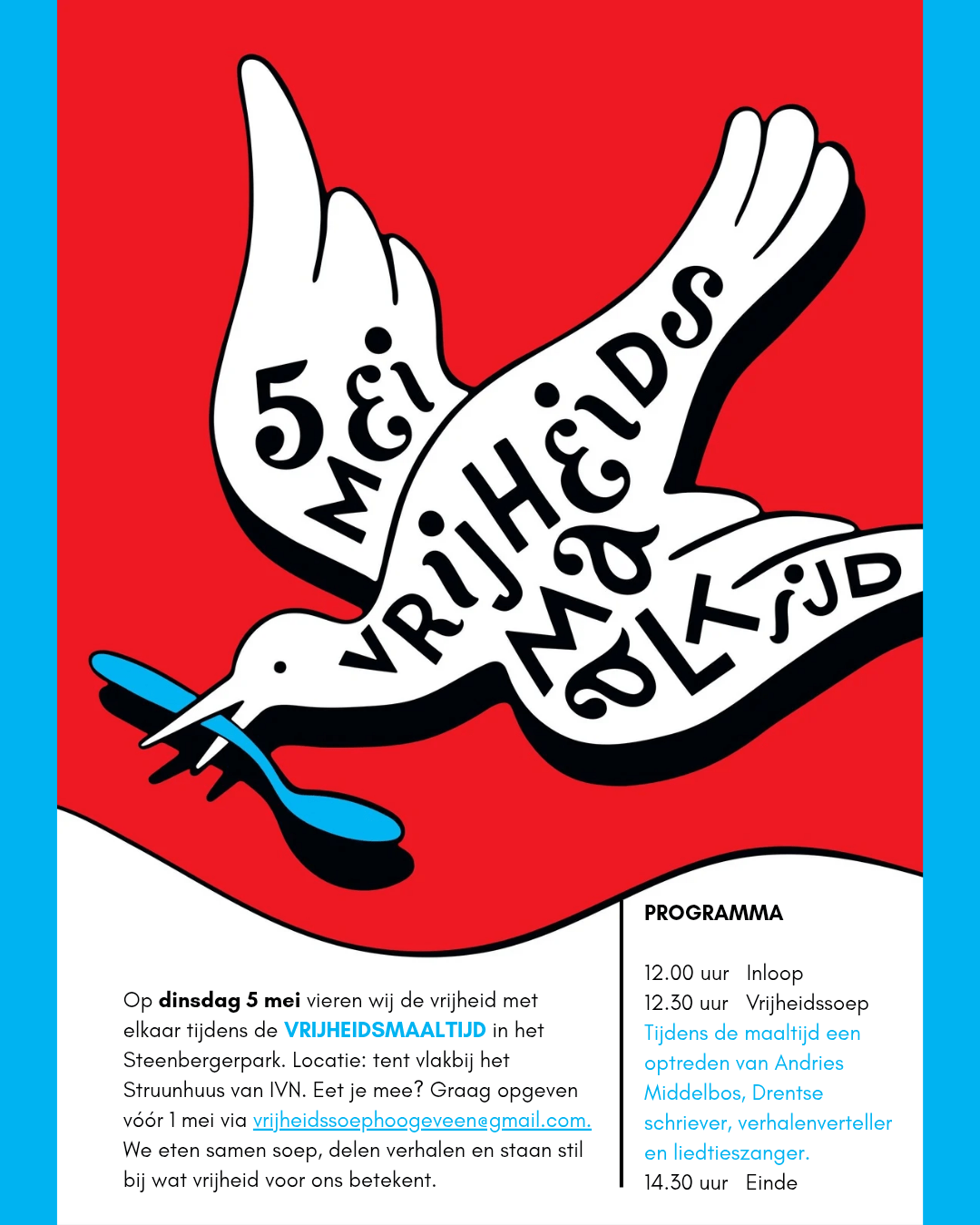 op 5 mei organiseert de werkgroep vrijheidsmaaltijd in het Steenbergerpark een vrijheidsmaaltijd. Vorig jaar is het klein begonnen bij de kinderboerderij de Beestenbult. Er was toen meer belangstelling dan plek....