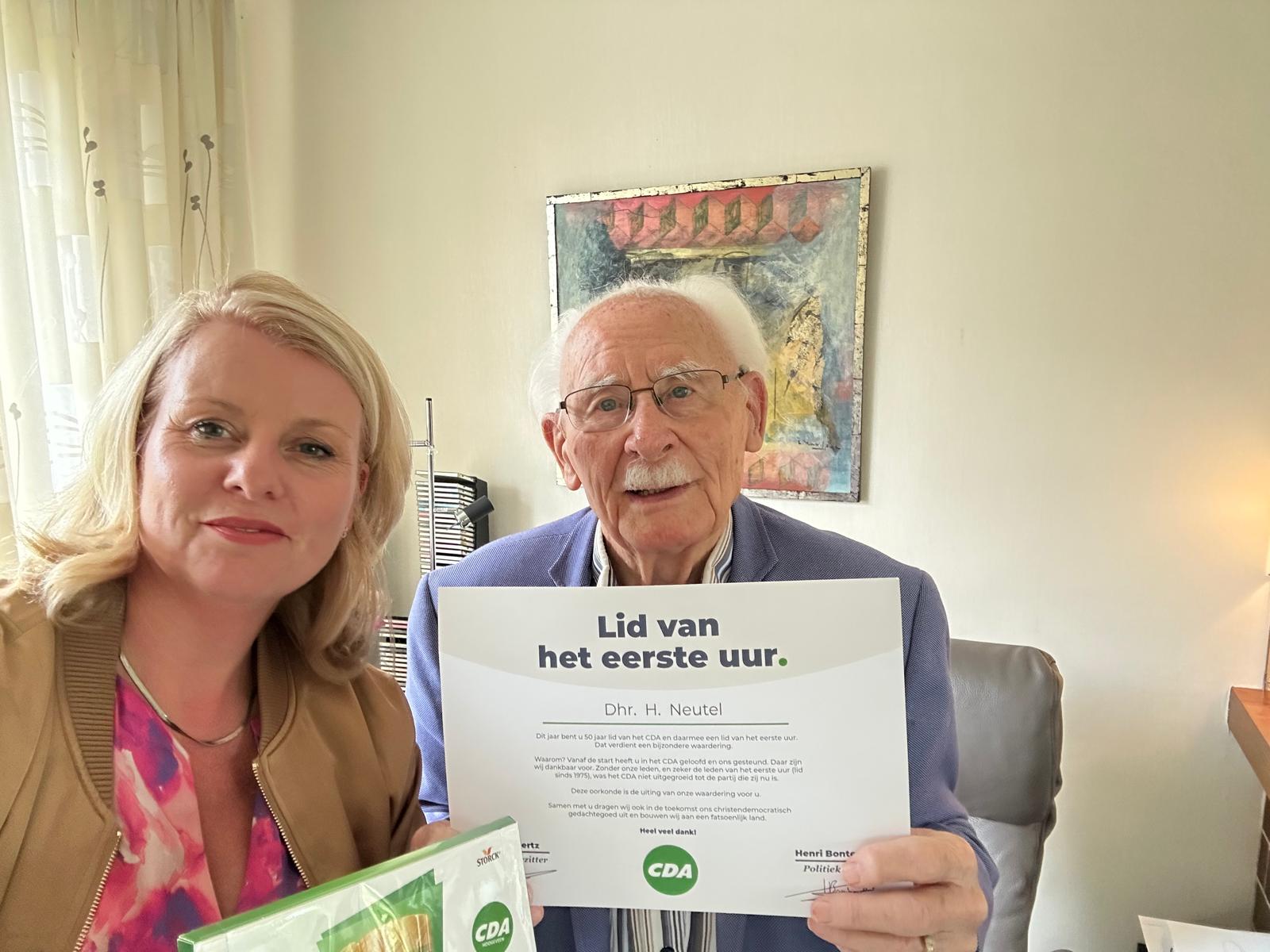CDA Hoogeveen heeft afgelopen zaterdag 23 augustus haar jubilarissen in het zonnetje gezet. Enthousiastelingen van de partij konden al 50 jaar geleden voor het eerst lid worden van de Federatie CDA in 1975. Pas vijf jaar later bestond de nieuwe volkspartij pas echt, door de fusie van ARP, KVP Landelijk werden de afgelopen week 3000 leden van het uurste uur door alle afdelingen in het zonnetje gezet. Ook 34 leden van het eerste uur in de gemeente Hoogeveen ontvingen een door de partijleider Henri Bontebal getekende oorkonde, en een doosje chocolade.