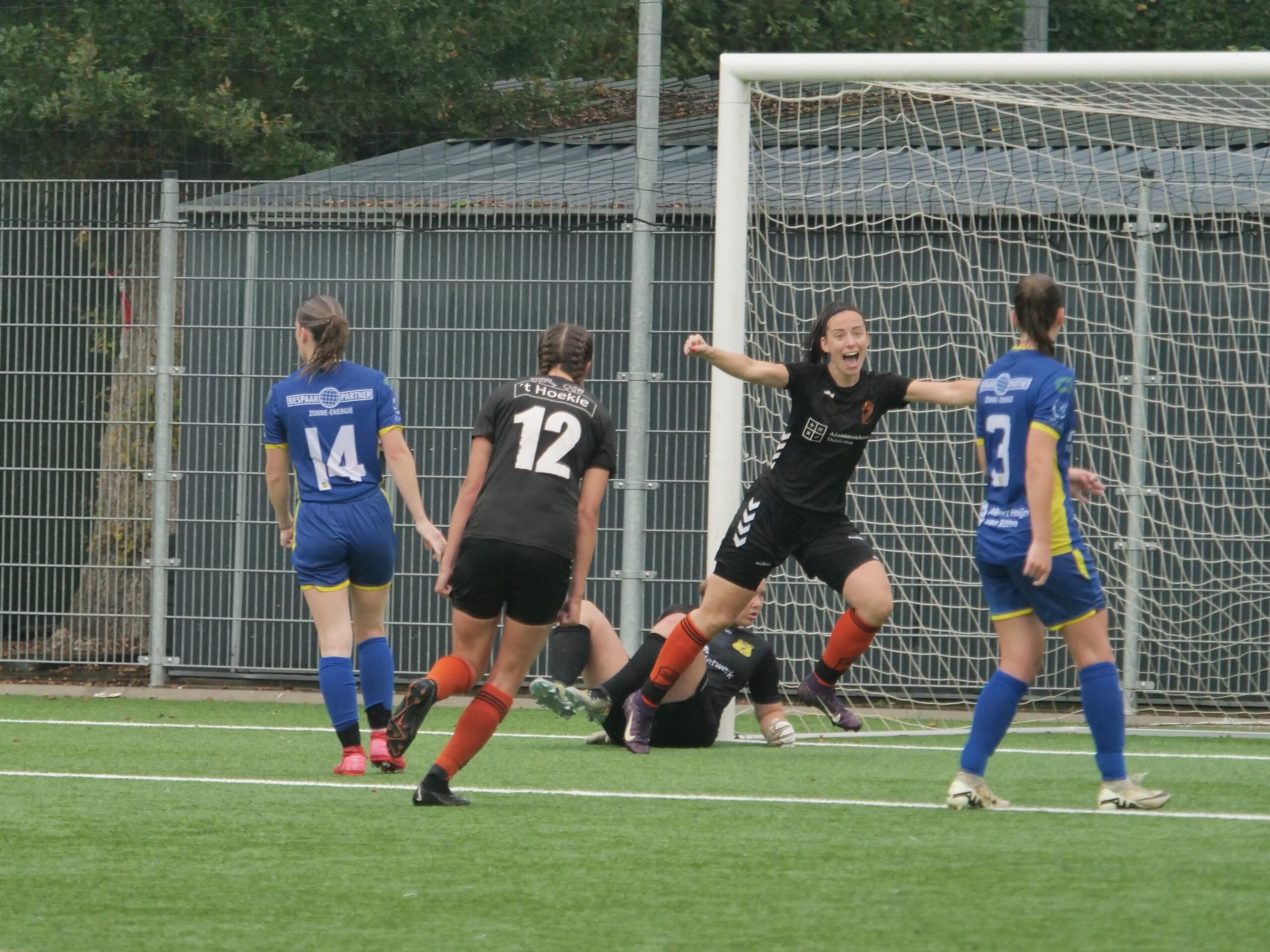 Het restant van de eerste helt zou qua tijd worden toegevoegd aan de tweede helft. Hierdoor viel het eerste doelpunt technisch gezien nog in de eerste helft. In de 43e minuut wist Kimberley namelijk op aangeven van Milady de score te openen. De tweede goal liet niet lang op zich wachten. Sabrina van Nuil mocht op het randje van het zestien meter gebied een vrije trap nemen. Ze slingerde de bal langs het muurtje in de hoop dat iemand de bal er in zou tikken. De bal leek echter aan alles en iedereen voorbij te gaan, zelfs Sabrina had er geen vertrouwen meer in. Maar vanuit het niets dook Elleke Snippe achter op en wist de bal toch binnen te tikken. De gasten hadden weinig in de melk te brokkelen. Niet dat ze slecht speelden, maar voor het doel van Charetha Okken wisten ze niet heel gevaarlijk te worden. Hollandscheveld wist echter wel de score te verdubbelen. Ranoe Vos en Shanya koster wisten respectievelijk de 3-0 en de 4-0 te maken en daarmee de overwinning veilig te stellen. Met de 4-0 overwinning staat Hollandscheveld na een wedstrijd op de tweede plaats. En komend weekend spelen ze tegen de Knickerbockers die door een 5-0 overwinning op de eerste plaats terug te vinden is.