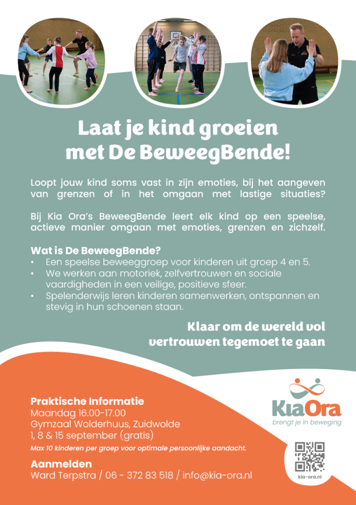 Zuidwolde – In september start Praktijk Kia Ora met een nieuwe groepsactiviteit, de BeweegBende: een actieve en speelse beweeggroep speciaal voor kinderen uit groep 4 en 5. Tijdens drie gratis proeflessen op maandag 1, 8 en 15 september kunnen kinderen en ouders vrijblijvend kennismaken met deze unieke vorm van bewegingsgerichte coaching.