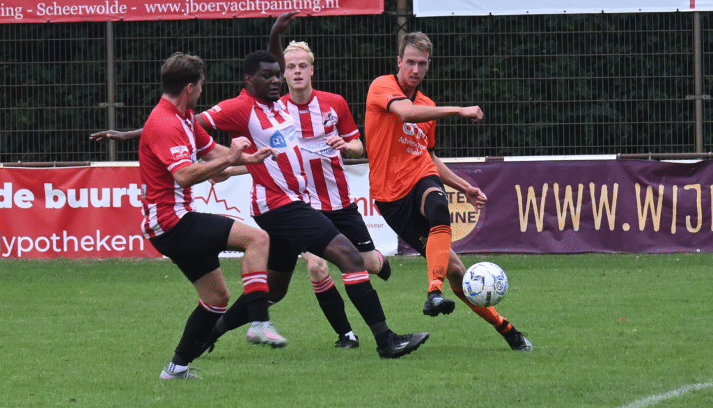Voor het eerst in competitie-verband,  trof Hollandscheveld de v.v. Steenwijk,  zaterdagmiddag in Steenwijk. Blessures waren er voor Bertin Kiers en Bryan Diphoorn. Trainer Bernard Koning had Enrico Doldersum en Bjorn Schonewille  opgeroepen om het team weer compleet te maken. De wedstrijd stond onder de prima leiding van scheidsrechter Stiekema. Steenwijk startte goed en snel stond het 1-0. Hollandscheveld was nog niet wakker blijkbaar. Wel pakten de oranje-zwarten het goed op. Martijn Dekker kreeg een grote kans, maar schoot niet raak. Hollandscheveld kwam wel op 1-1 door Luuk van Eck.  Er zat te weinig voetbal in bij Hollandscheveld vandaag. Veel lange ballen waren dan ook te zien. Hollandscheveld kwam voor rust wel op 1-2 door Robin Koopman. In de rust kwam Danny Mol zijn broer Maykel vervangen. En in de tweede helft werden ook Leroy Schonewille voor zijn broer Daimen, en Bjorn Schonewille voor Robin Koopman ingebracht.  Via een corner kwam de 1-3 op het scorebord. Op aangeven van Matthijs Snippe kon Jan Hagen scoren.  De wedstrijd was nog niet gelopen. Steenwijk ging er voor en maakte de aansluittreffer, 2-3. Het slotoffensief van Steenwijk leverde verder geen grote kansen op. Behalve een gevaarlijk schot van Clint Kruisweg van Steenwijk. Zo won Hollandscheveld verdiend met 2-3 in en van Steenwijk. Zaterdag 4 oktober wordt het een boeiende middag op sportpark de Oosthoek. Nieuwlande , het dorp dat zweeg, komt namelijk op bezoek. Maar het zal geen zwijgende middag worden. SCN uit Nieuwlande is namelijk de trotse koploper. En SCN is zaterdag 4 oktober om 14.30 uur in Hollandscheveld de tegenstander. Een mooie derby met als inzet de koppositie.