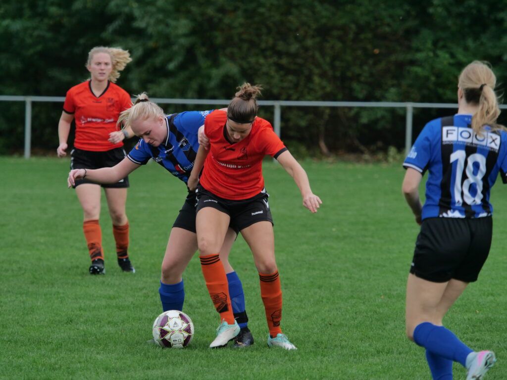 Maar waar de onderlinge strijd vorig seizoen leuke en spannende wedstrijden opleverde, duurde het nu lang voordat de wedstrijd op gang kwam. Hollandscheveld had moeite om de bal in de ploeg te houden en ook Zuidwolde wist niet te schitteren. Wat resulteerde was flipperkastvoetbal. Het eerste kansje kwam dan ook pas na ongeveer twintig minuten spelen. Het was een bal die vanuit een corner van Zuidwolde over het doel ging. De eerste kans voor Hollandscheveld kwam pas na een half uur spelen. Lang leek het daarom op een 0-0 ruststand af te stevenen. Maar vlak voor rust wist Zuidwolde toch te scoren. Zuur voor de Oranje-Zwarte dames, maar niet geheel tegen de verhoudingen in.