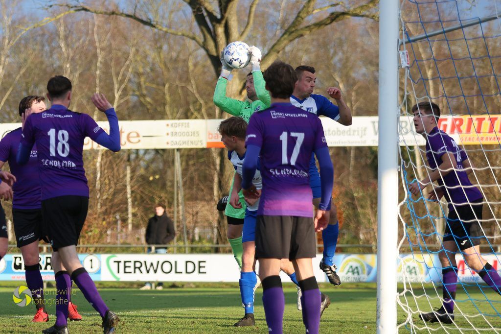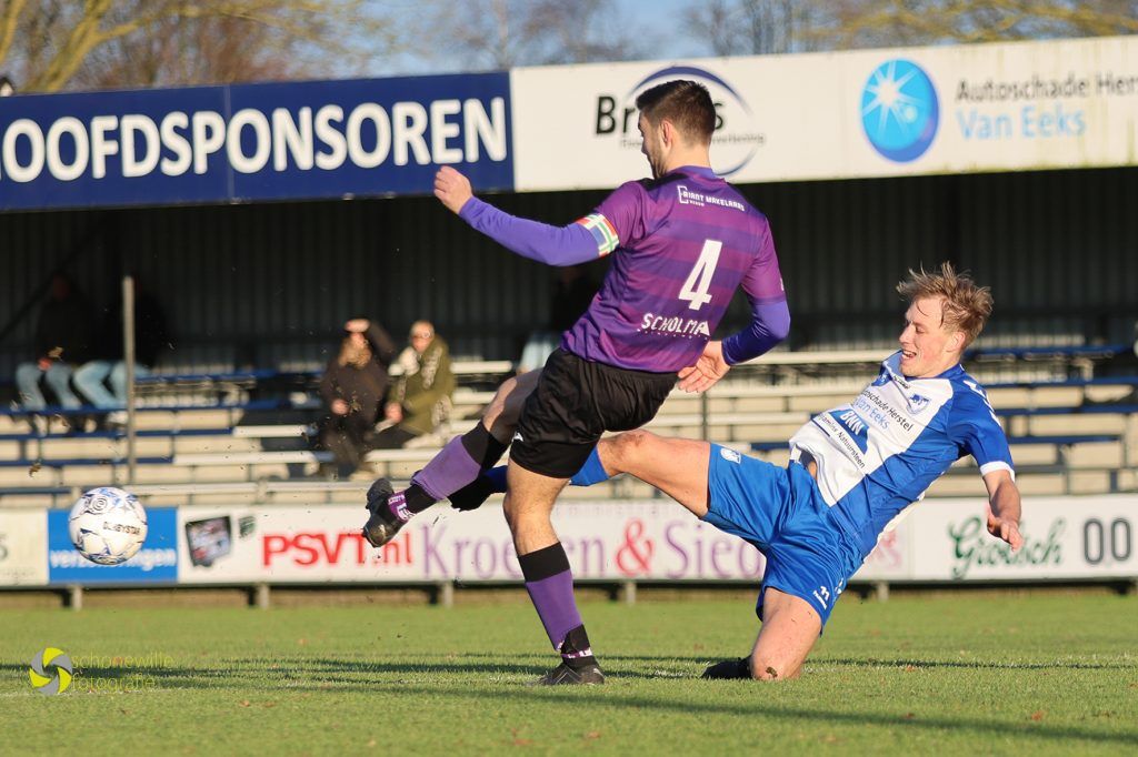 Na een kleine twintig minuten deden de bezoekers opnieuw van zich spreken. Een ziedend schot van Thijs Boer zette koers richting kruising, maar met een fabelachtige redding redde Vos het speeltuig uit de bovenhoek. Aan de andere zijde bereikte een vrije bal van Melvin Mol het hoofd van Bjorn Schonewille, maar diens kopbal verdween over de uitkomende keeper en het doel. Noordscheschut nog steeds de bovenliggende partij, maar de bezoekers kwamen er bij vlagen gevaarlijk uit. Het laatste wapenfeit van het eerste bedrijf kwam van de van Patrick Venema, maar hij mikte te hoog.