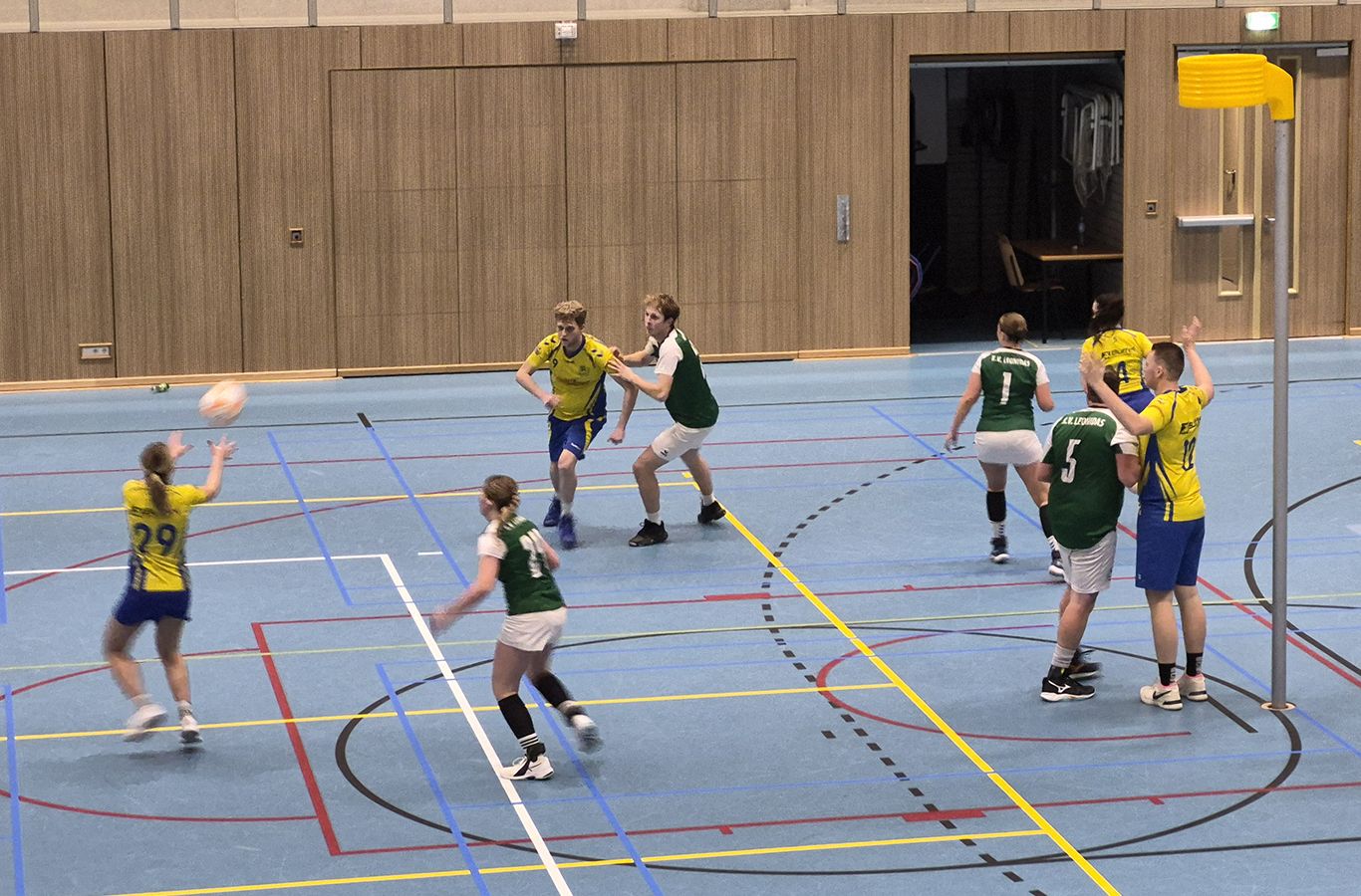 De eerste helft verliep spannend en ging gelijk op. Beide teams hielden elkaar goed in evenwicht en wisten regelmatig te scoren. Er werd fel verdedigd en geen van beide ploegen kon een duidelijk verschil maken. Dit resulteerde in een gelijke stand bij rust: 7-7.