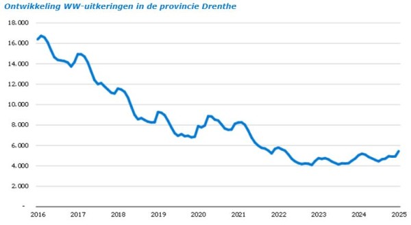 | Ontwikkelingen WW-uitkeringen januari 2025: Meer WW-uitkeringen in Drenthe in januariEind januari 2025 verstrekte UWV 5.445 WW-uitkeringen in de provincie Drenthe. Ten opzichte van vorige maand is dit een toename van 10,4% (513 uitkeringen). Landelijk is sprake van een toename van 8,4%. Ook ten opzichte van een jaar geleden is het aantal WW-uitkeringen hoger. De regionale stijging is 408 uitkeringen (+8,1%). Deze toename is kleiner dan de landelijke stijging van het afgelopen jaar (+13,4%).Meer informatie over de arbeidsmarkt staat op Arbeidsmarktinformatie (werk.nl). |