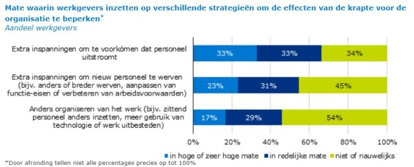 | Omgaan met krapte: werkgevers zetten vooral in op personeelsbehoud Werkgevers die de gevolgen van personeelskrapte ervaren, zetten vooral in op het behoud van personeel. Daarnaast geven zij aan extra inspanningen te verrichten bij het vinden van nieuw personeel. Zo werven zij bijvoorbeeld op een andere manier of passen zij de functie-eisen aan. Werkgevers kiezen er het minst vaak voor om werk anders te organiseren als zij te maken krijgen met krapte. Als werkgevers ervoor kiezen werk anders te organiseren binnen hun bedrijf, doen ze dat vooral door te zorgen dat medewerkers breed inzetbaar zijn en door werkprocessen efficiënter te maken. UWV ondersteunt werkgevers graag in het oplossen van hun personeelstekorten. In de 34 oplossingen voor werkgevers geeft UWV tips en deelt ervaringsverhalen van werkgevers die personeelstekorten op originele wijze aangepakt hebben. |