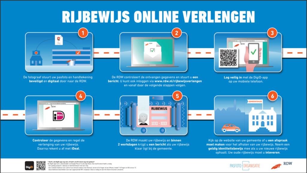 Om online te verlengen heb je een telefoon nodig met een werkende Digi-D app. Wel moet je een ID check hebben gedaan. Dit betekent een ID-check het eenmalig scannen van een Nederlands identiteitsbewijs (paspoort, ID-kaart of rijbewijs) met een telefoon met NFC-chip, om de app te koppelen aan je identiteit. En lukt dit laatste je niet? Ook hier kan ik je mee helpen. Gewoon een stukje service wat je mist bij een pasfotoautomaat.